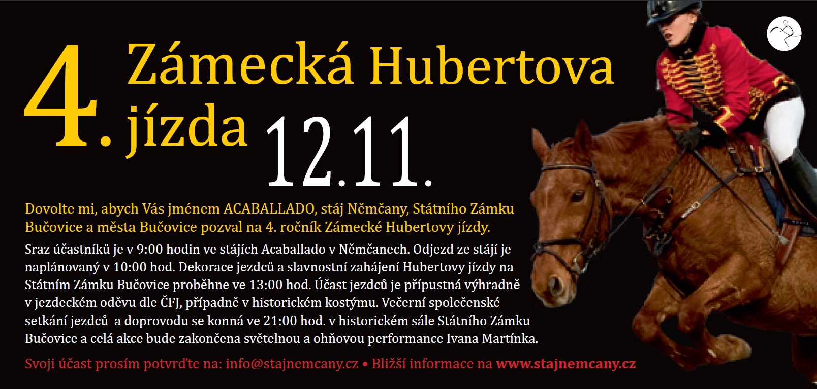 Dovolte mi, abych Vás jménem ACABALLADO, stáj Němčany, Státního Zámku Bučovice a města Bučovice pozval na 4. ročník Zámecké Hubertovy jízdy. Sraz účastníků je v 9:00 hodin ve stájích Acaballado v Němčanech. Odjezd ze stájí je naplánovaný v 10:00 hod. Dekorace jezdců a slavnostní zahájení Hubertovy jízdy na Státním Zámku Bučovice proběhne ve 13:00 hod. Účast jezdců je přípustná výhradně v jezdeckém oděvu dle ČJF, případně v historickém kostýmu. Večerní společenské setkání jezdců a doprovodu se koná ve 21:00 hod. v historickém sále Státního Zámku Bučovice a celá akce bude zakončena světelnou a ohňovou performance Ivana Martínka. Svoji účast prosím potvrďte na: info@stajnemcany.cz